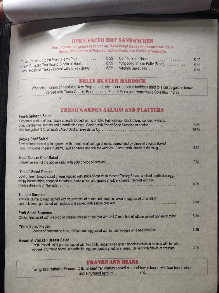 Lunch and dinner selections also shine, featuring roasted turkey, grilled chicken, and a variety of open-faced sandwiches. The dessert menu boasts enticing options like hot fudge brownies and assorted pies, rounding out a delightful dining experience for every guest.
